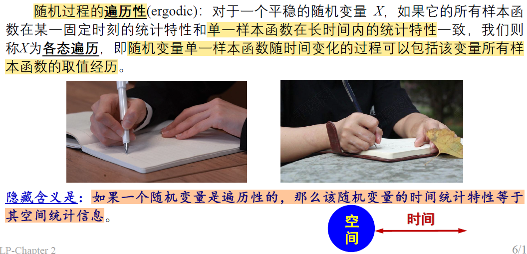 B(时间平均):你选定一个男孩,从他出生开始,每年在他生日那天测量他的身高,一直测到他 60 岁。然后,你从他 30 岁那年的测量值开始,取到 40 岁,这 10 个数据的平均值作为 “30 岁男性平均身高” 的估计。 - 这相当于对随机过程(这个男性的身高变化)在时间轴上求平均。
