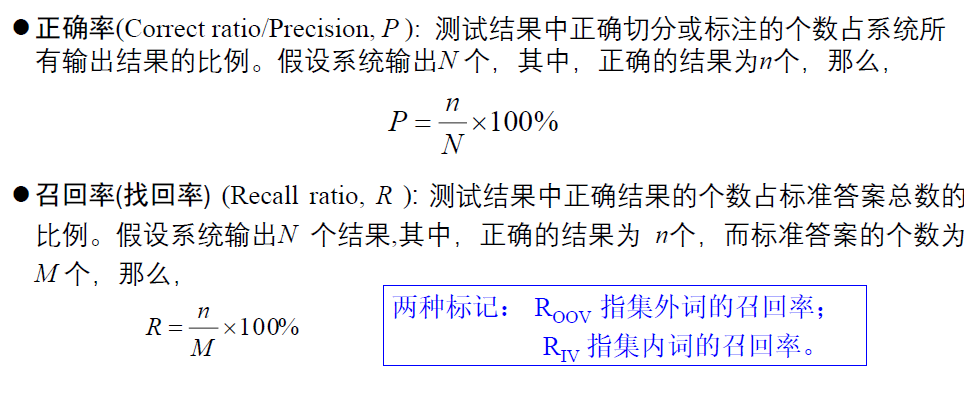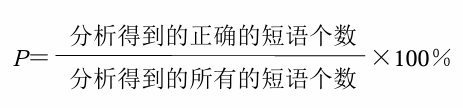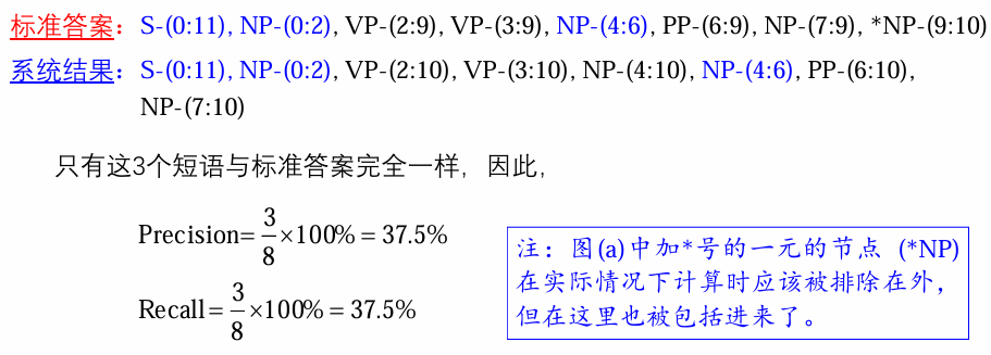 精度(precision):句法分析结果中正确的短语个数所占的比例,即分析结果中与标准分析树(答案)中的短语相匹配的个数占分析结果中所有短语个数的比例, 即: