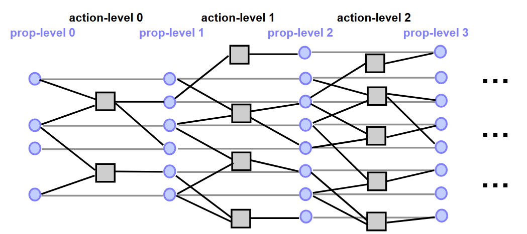 0 层为初始状态。 每个层级包含一组命题文字和一组动作,并通过边连接动作的前提条件与效果。