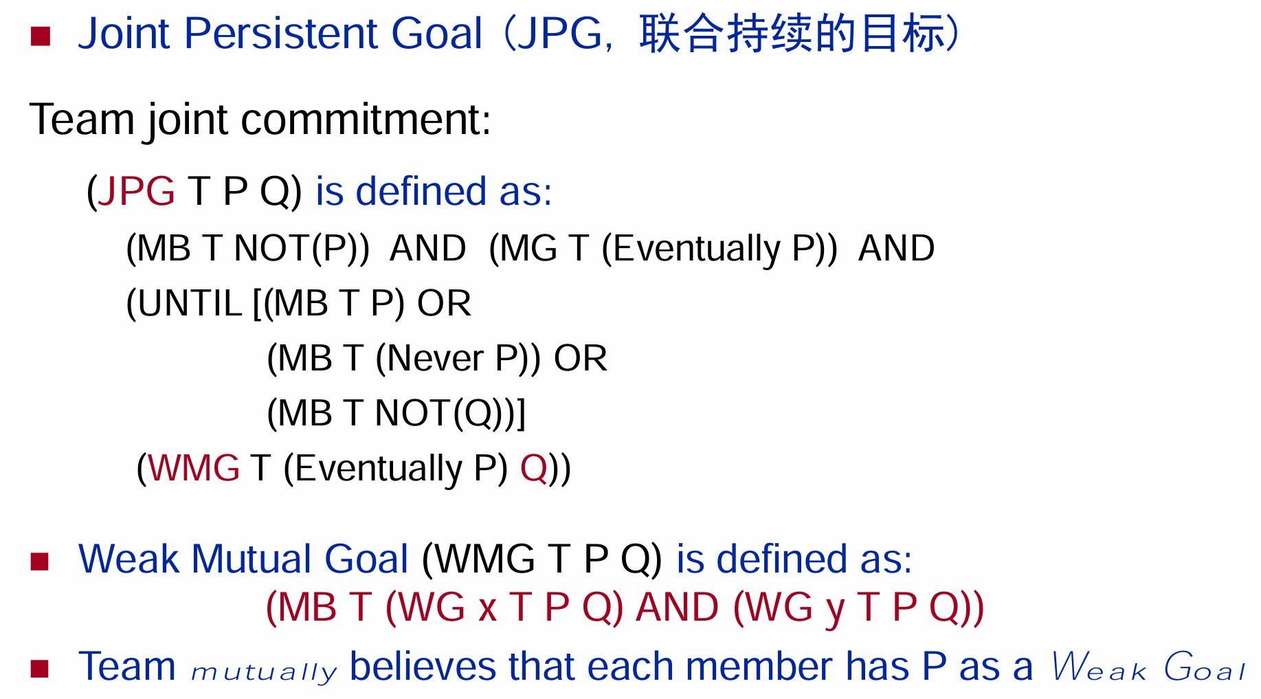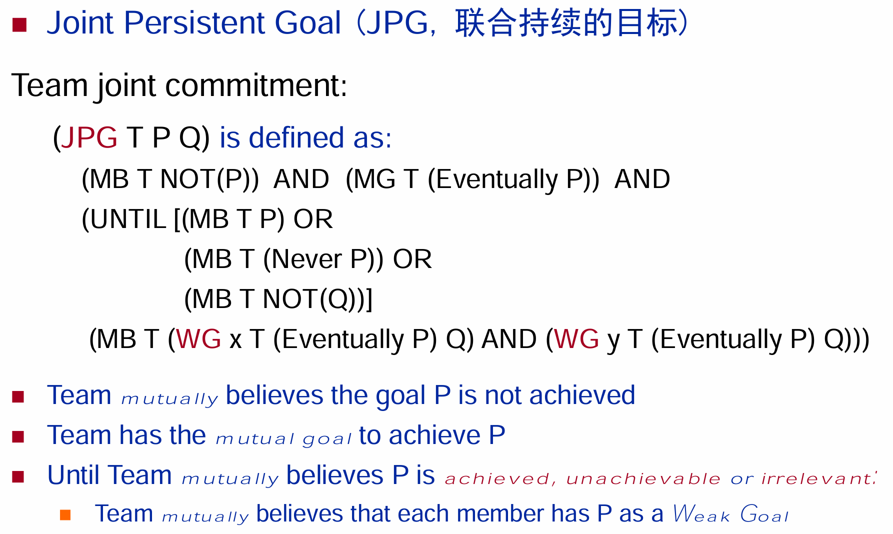- 联合持续的目标(Joint Persistent Goal, JPG):这是定义团队承诺的核心概念。它要求团队共同相信目标尚未达成,并拥有实现该目标的共同目标 。